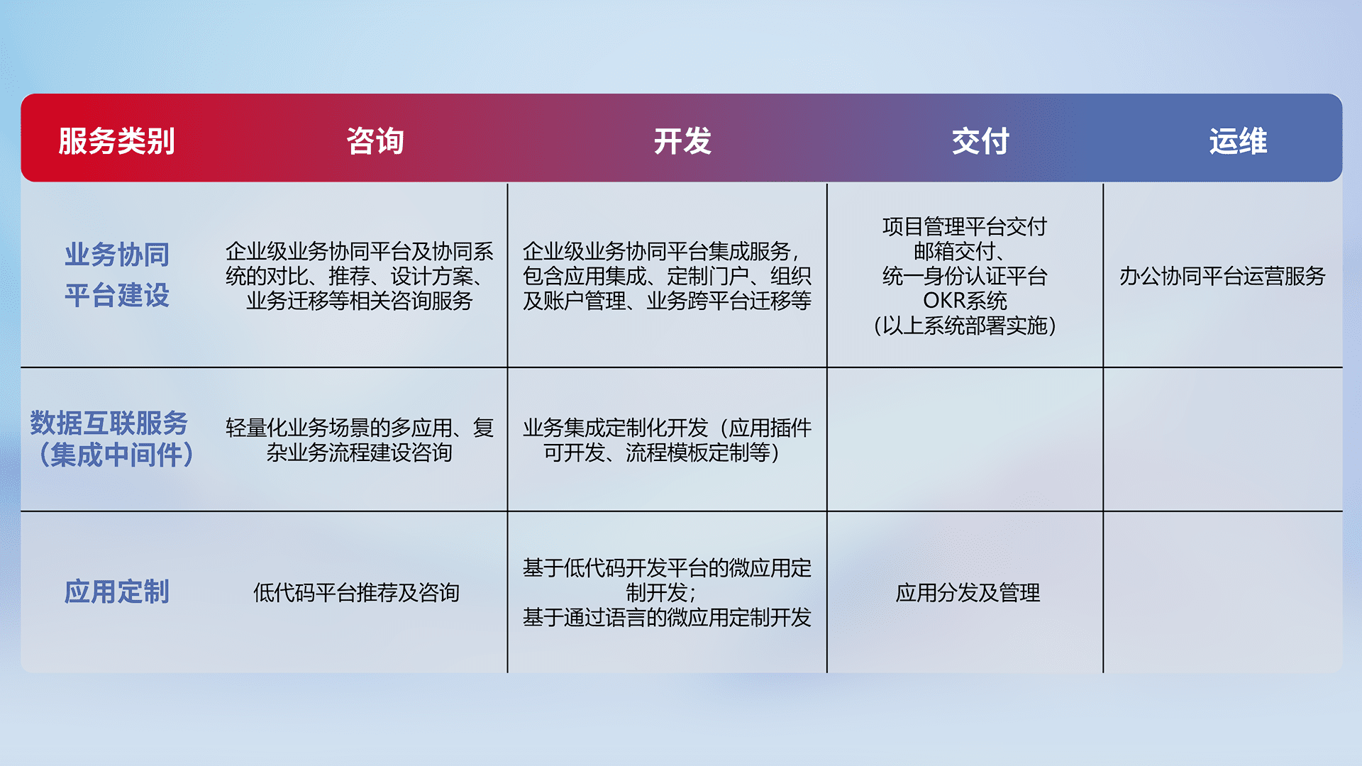 针对钉钉、、企微、、IDaas等平台级产品提供产品的规划、、、方案、、、、交付、、定制化开发等服务,,,实现如统一协同办公、、智能客户服务、、、混合会议管理、、、、智能数据查询、、、、等业务场景,,,,实现数字化转型。。。。